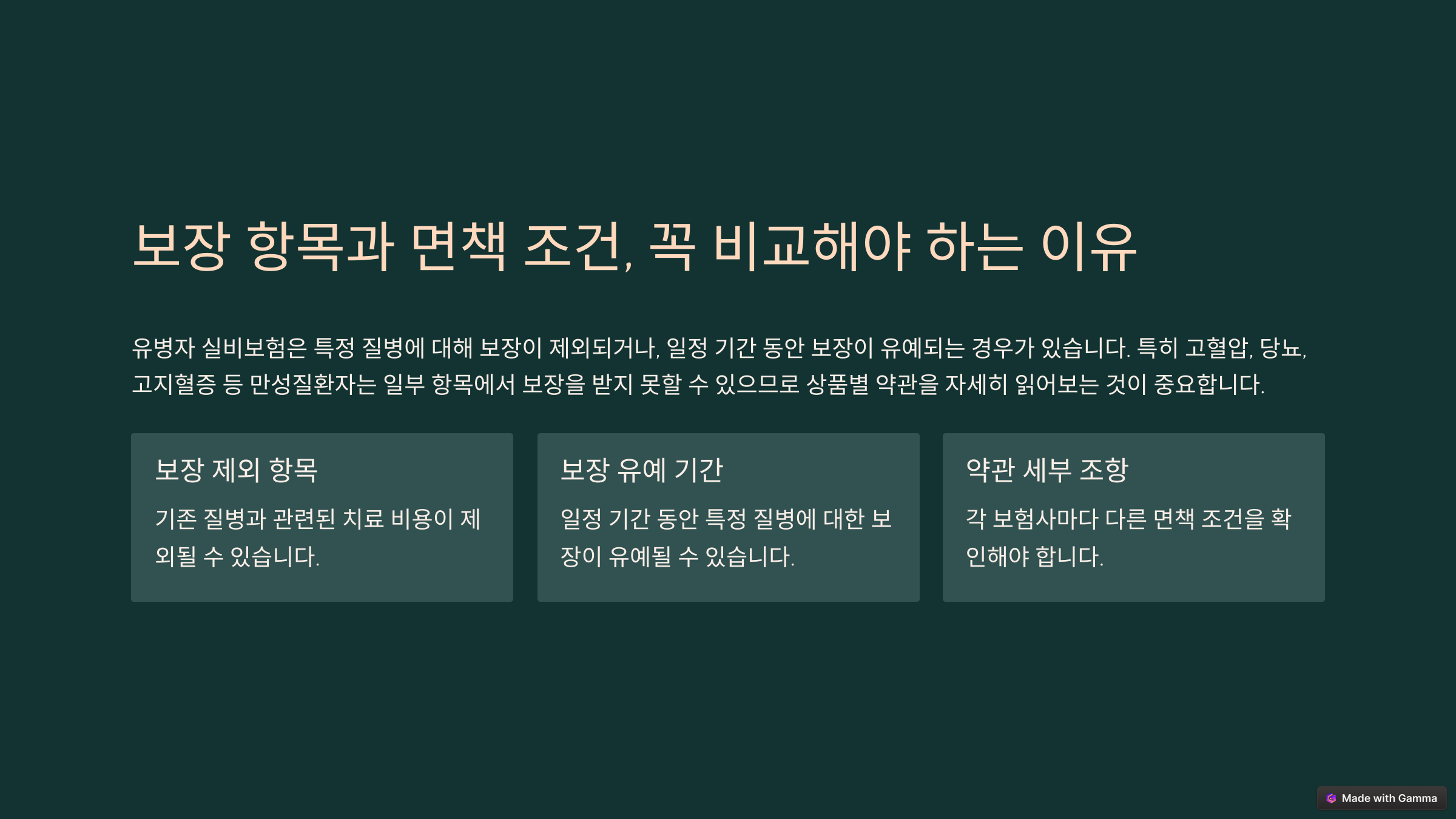 | 보험사별 조건 비교 | 보험사마다 심사 기준이 다르므로 비교 필수 |
